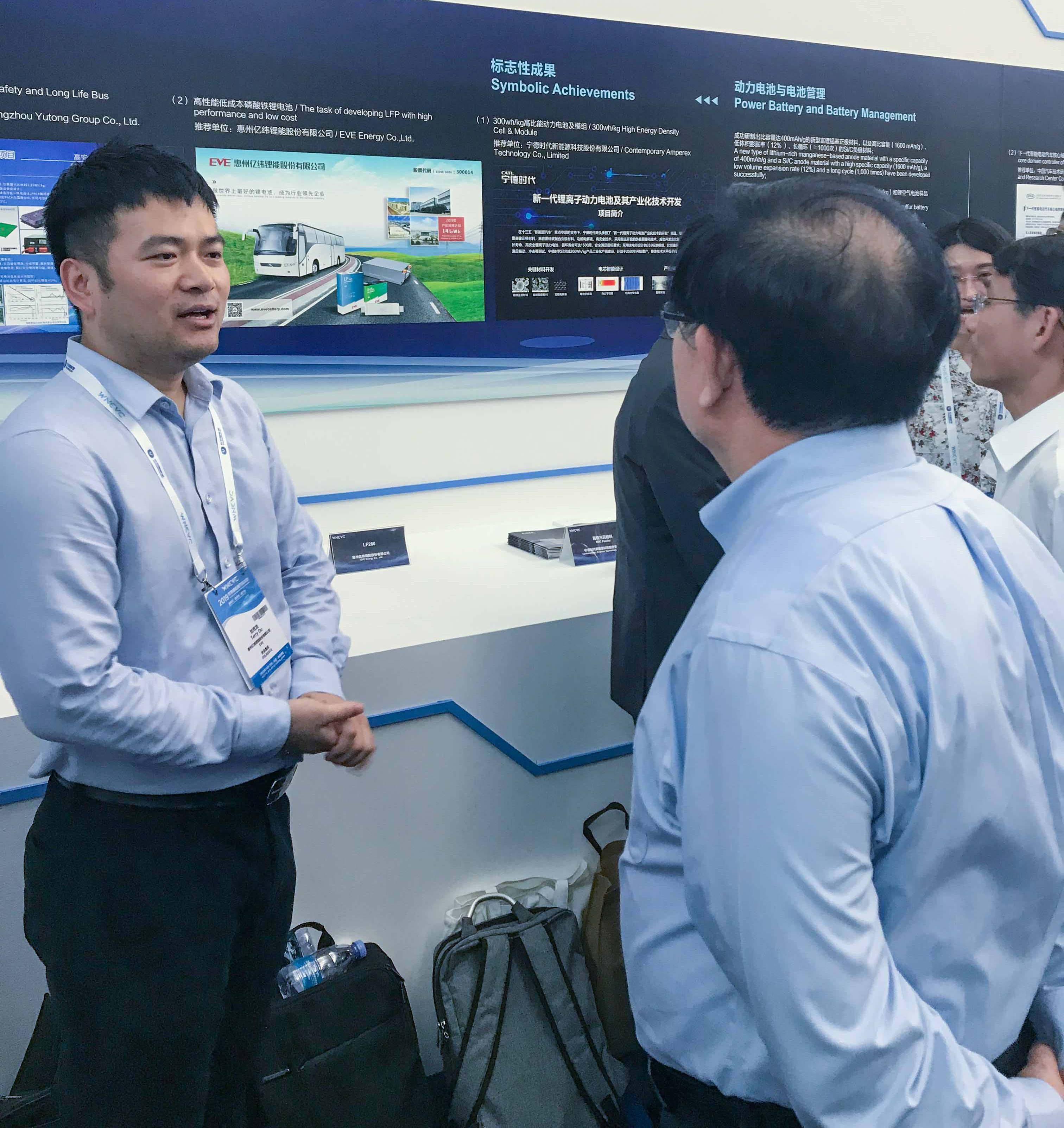在会展现场,亿纬锂能项目负责人杜双龙博士详细的向中国科协主席万钢等领导和专家们介绍了此项目的研发成果和项目背景,万主席对电池的能量密度和续航能力表达了关注。