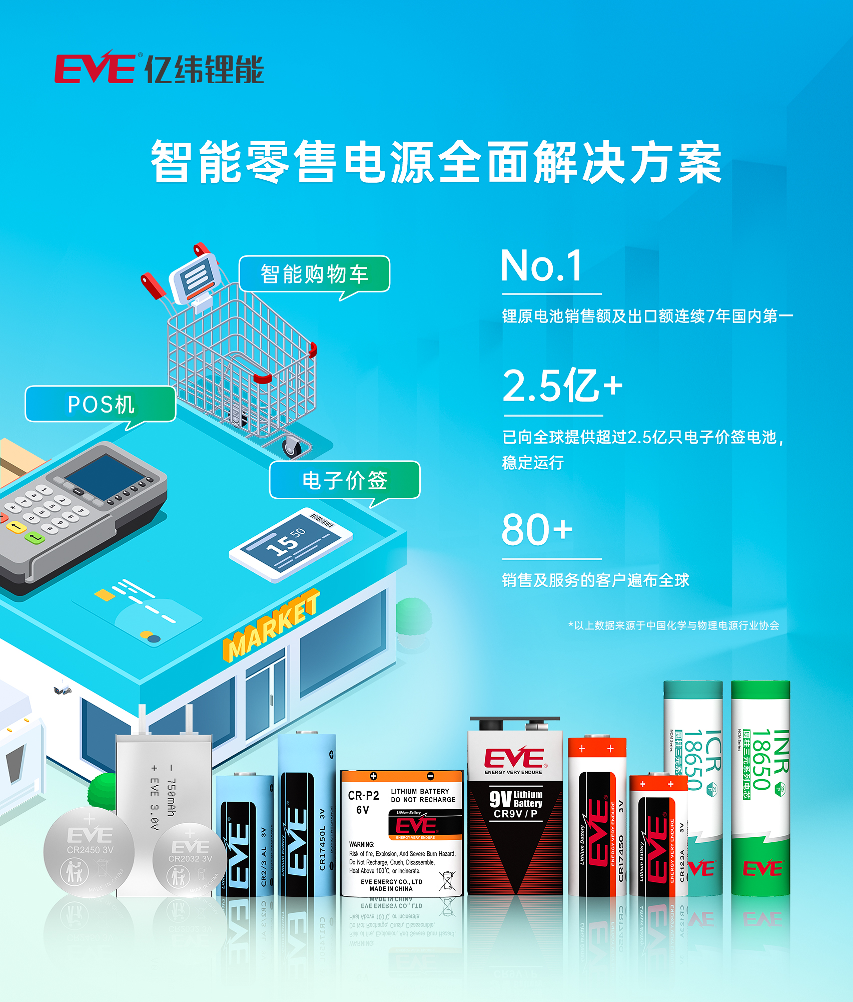 基于可靠性设计、先进制造技术、全方位测试、标准化管控,亿纬锂能智能零售电源解决方案具备高安全、长寿命,低自放电,全寿命周期脉冲能力强的优势性能,已向全球提供超过2.5亿只电子价签电池,稳定运行。产品广泛应用于智能购物车、POS机、电子价签等应用领域。