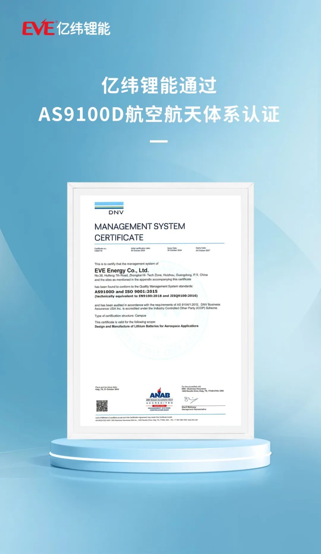 近日,亿纬锂能获得DNV颁发的AS9100D航空航天质量管理体系认证证书(Certificate No.: C690714),通过范围为:航空航天用锂电池的设计、制造和销售、售后。标志着亿纬锂能质量管理体系达到航空航天用锂电池全生命周期质量管理要求。