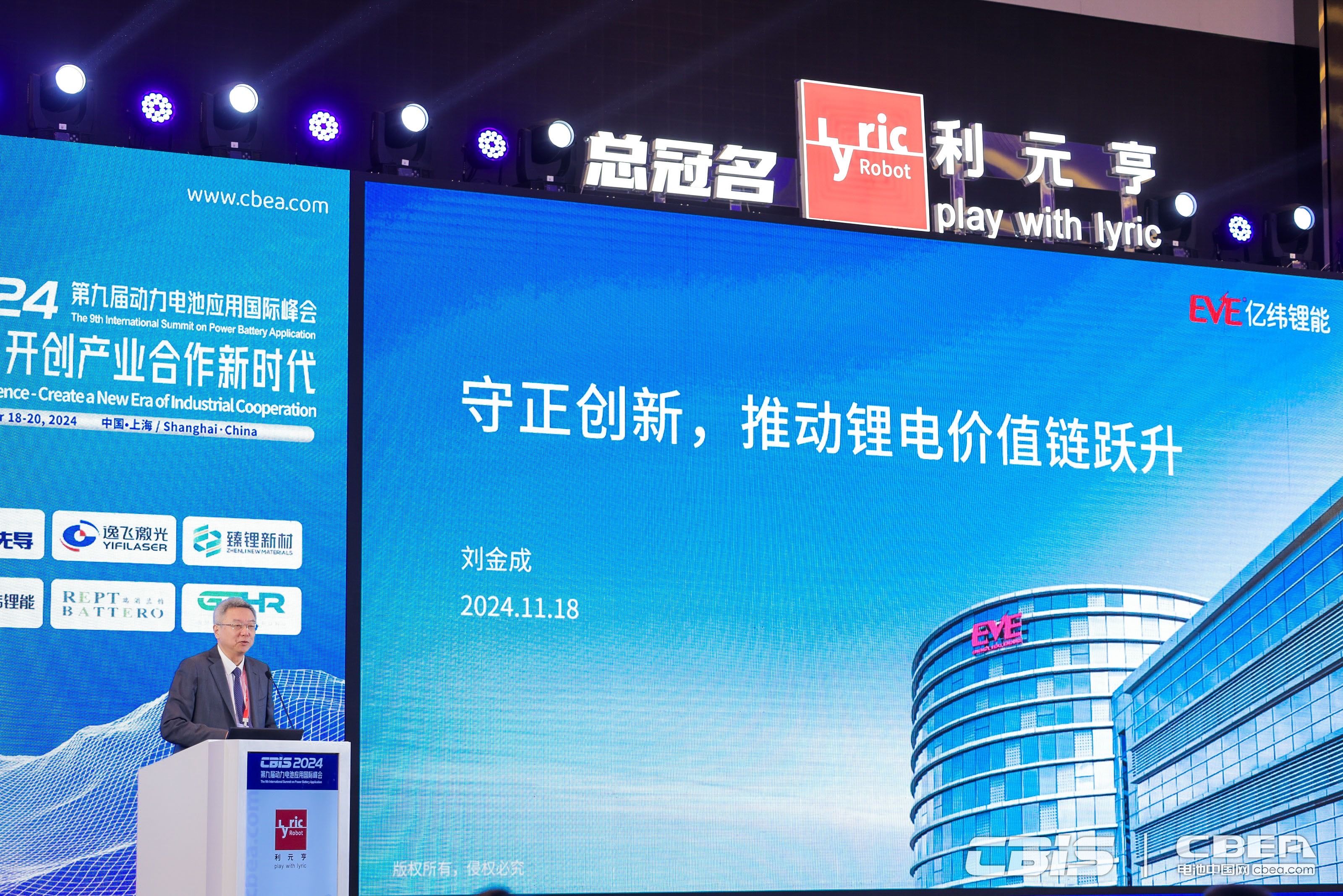 11月18日,以“向新融合-开创产业合作新时代”为主题的第九届动力电池应用国际峰会(CBIS2024)在上海拉开帷幕。亿纬锂能董事长刘金成博士受邀在开幕式上发表主题演讲,向与会嘉宾介绍锂电池产业的发展现状、锂电池企业的商业化路径,以及分享亿纬锂能的战略规划,并呼吁行业向绿色、可持续良好态势发展。